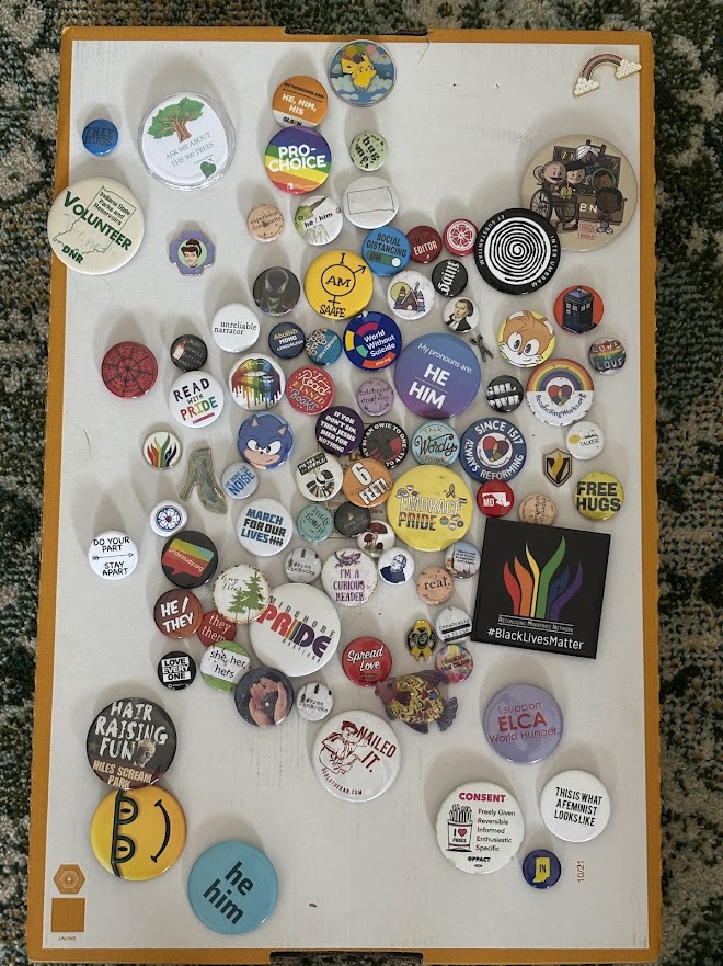 Ready? Here’s how I went about it: I grabbed a clean, flat box from the recycling pile and stuck all the pins in it. After about 10 minutes I realized I could stick them in in aesthetically pleasing ways. After a half hour (during which I was rewatching Gravity Falls), I could see all my buttons for the first time in years.